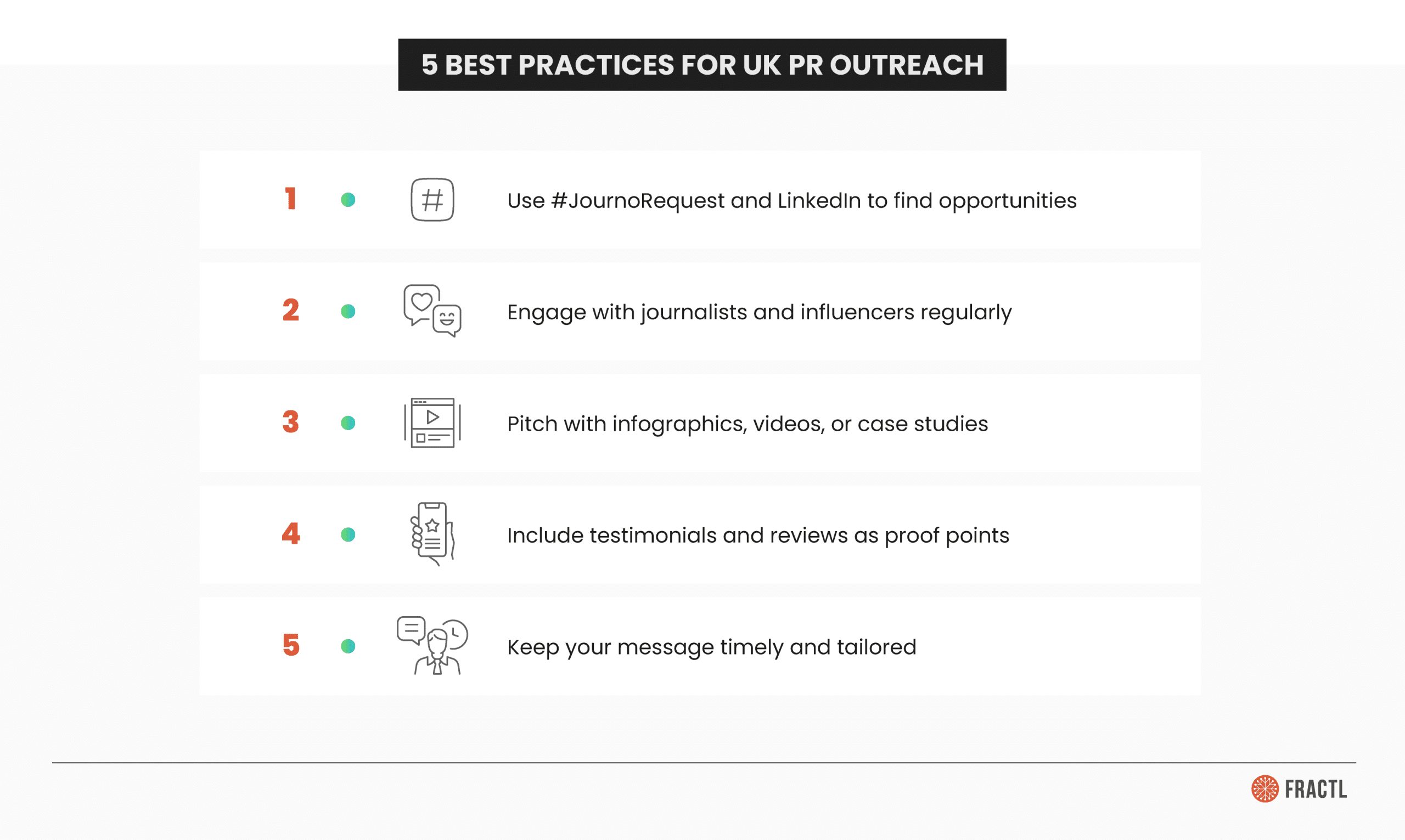 Infographics, video content, user-generated content, and case studies offer tangible value to journalists. They also serve as visual hooks that make your pitch more shareable across digital media. The more engaging and easy-to-use your assets are, the more likely they are to be featured in a news story or repurposed across multiple media platforms.